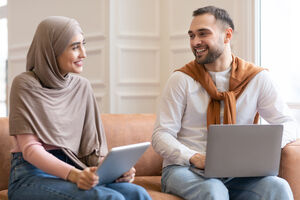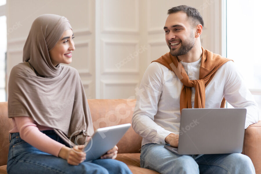 Arab Muslim woman in hijab and caucasian husband looking at each other smiling while sitting with laptop and tablet on sofa in living room at home