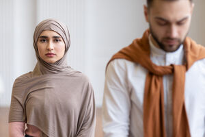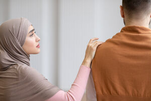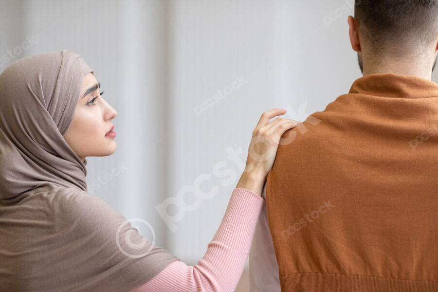 Arab Muslim woman in hijab touching shoulder of her husband ignoring her while standing at home