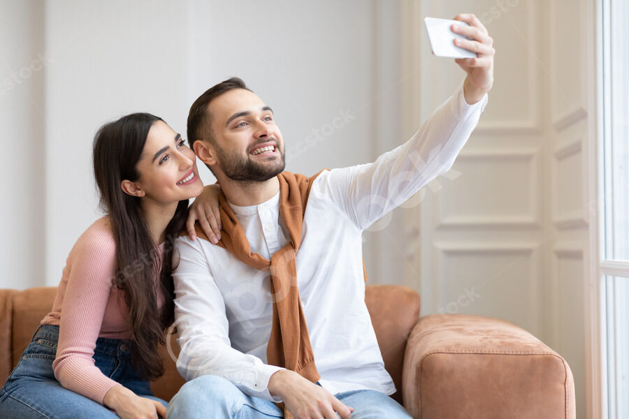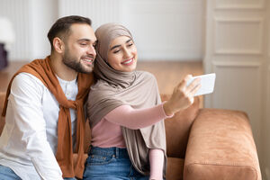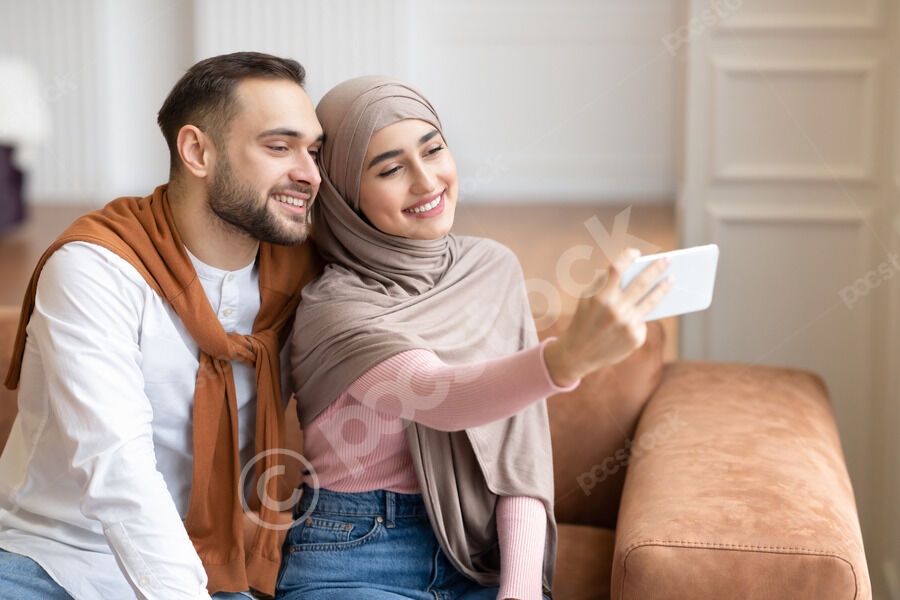 Arab Muslim woman in hijab and caucasian husband taking selfie on smartphone while sitting on sofa in living room at home