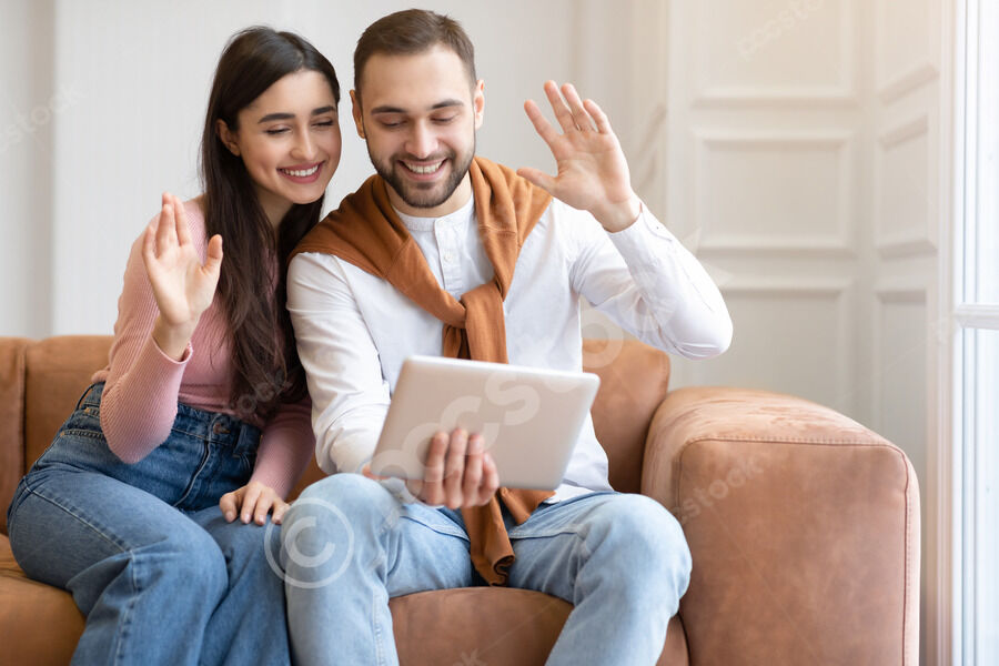 Arab and caucasian couple having video call on tablet and waving their hands while sitting on sofa in living room at home