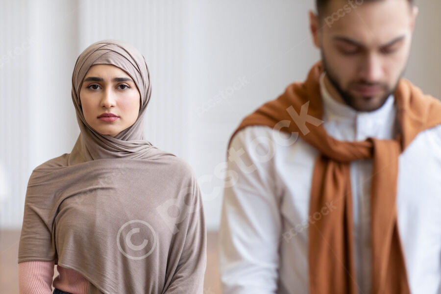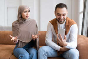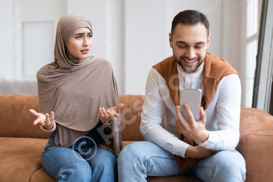 Unhappy Arab Muslim woman in hijab looking her husband using smartphone and ignoring her while sitting together on sofa in living room at home