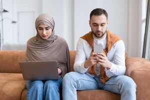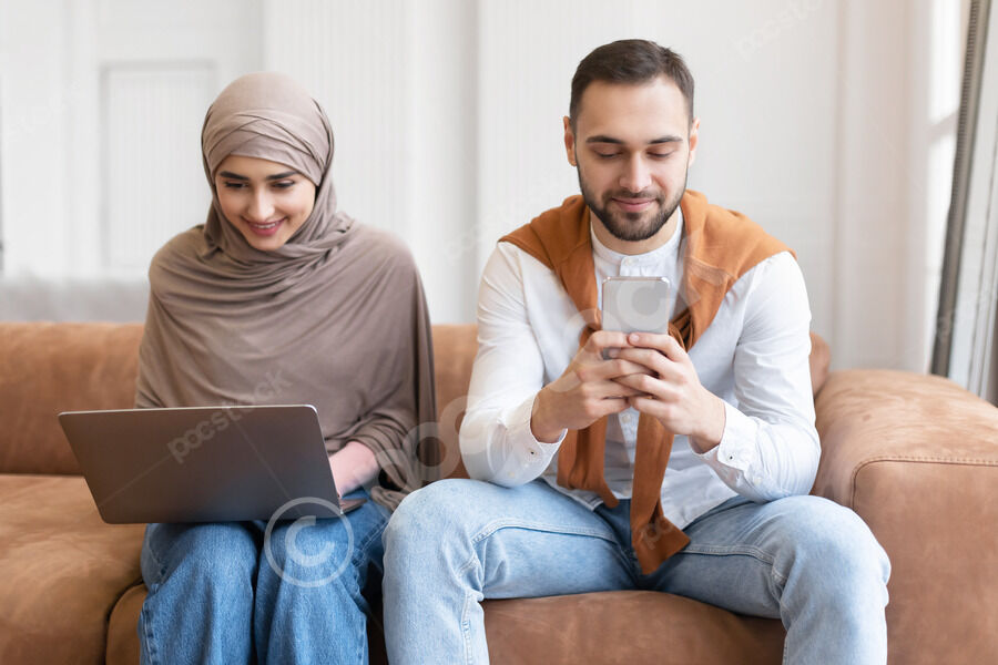 Arab Muslim woman in hijab and caucasian husband using laptop and smartphone while sitting together on sofa in living room at home
