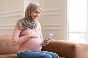 Arab Muslim pregnant woman in hijab touching her belly and using smartphone while sitting on sofa in living room at home