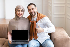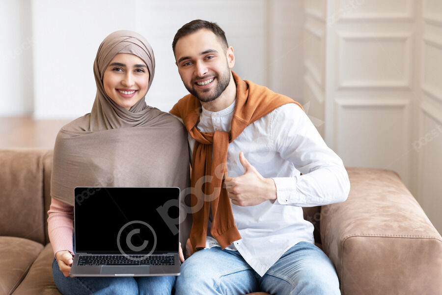 Arab Muslim woman in hijab and caucasian husband gesturing thumbs up while sitting with laptop on sofa in living room at home