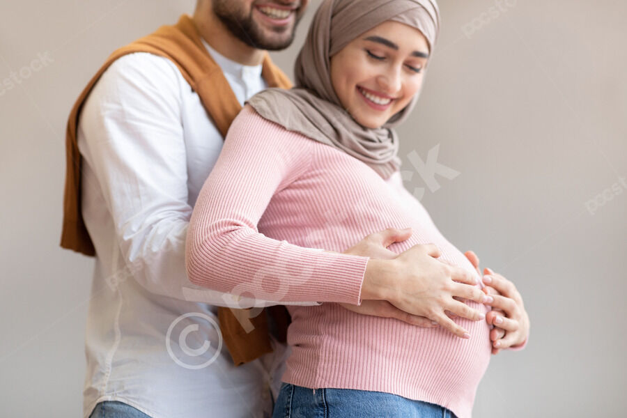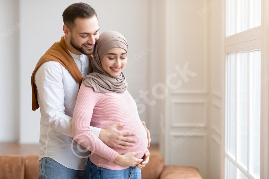Arab Muslim pregnant wife in hijab being hugged by her caucasian husband while standing at home