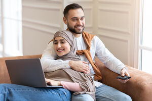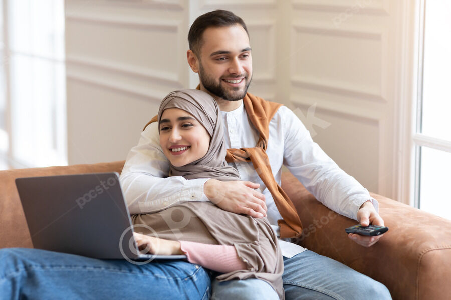 Arab Muslim woman in hijab using laptop leaning on her caucasian husband sitting on sofa and watching TV in living room at home