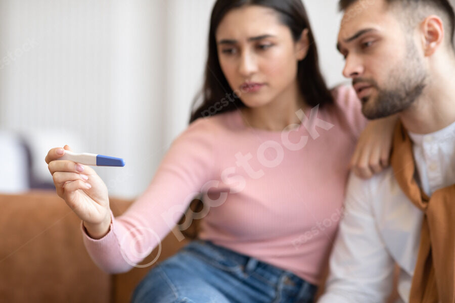 Unhappy Arab and caucasian couple holding negative pregnancy test while sitting together on sofa at home