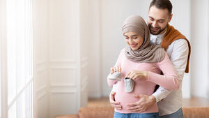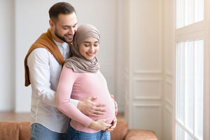 Arab Muslim pregnant wife in hijab holding tiny shoes and being hugged by her caucasian husband while standing at home