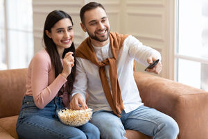 Arab Muslim wife in hijab watching TV and eating popcorn with her caucasian husband while sitting on sofa in living room at home