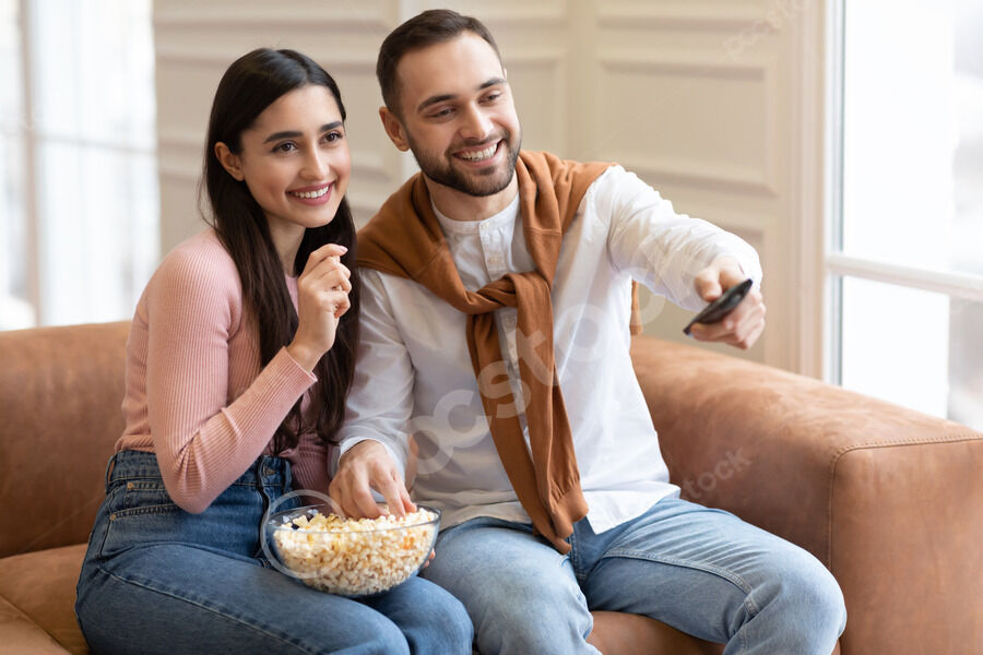 Arab and caucasian couple watching movie on TV and eating popcorn while sitting on sofa in living room at home
