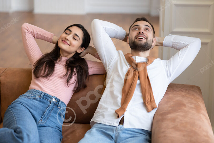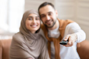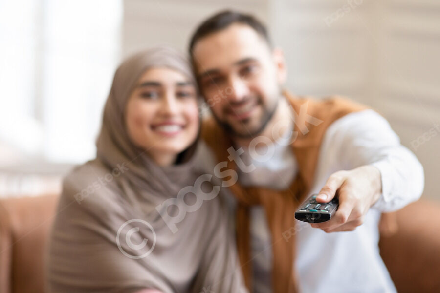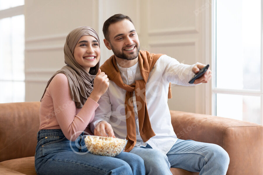 Arab Muslim woman in hijab and caucasian husband watching TV together while sitting on sofa in living room at home