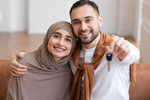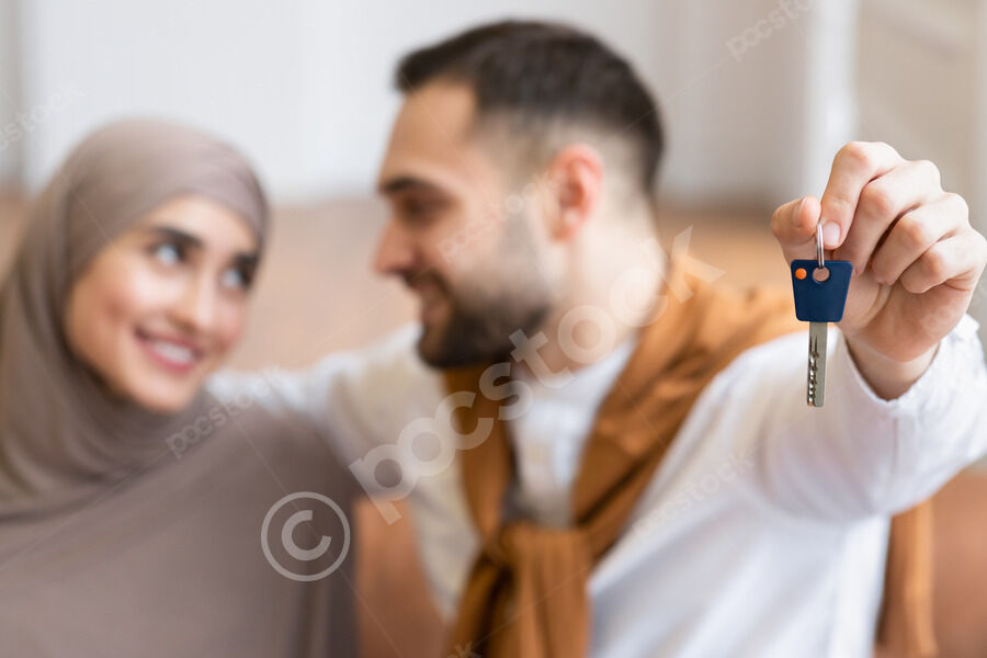 Arab Muslim woman in hijab and caucasian husband showing new house key and smiling while sitting on sofa in living room at home