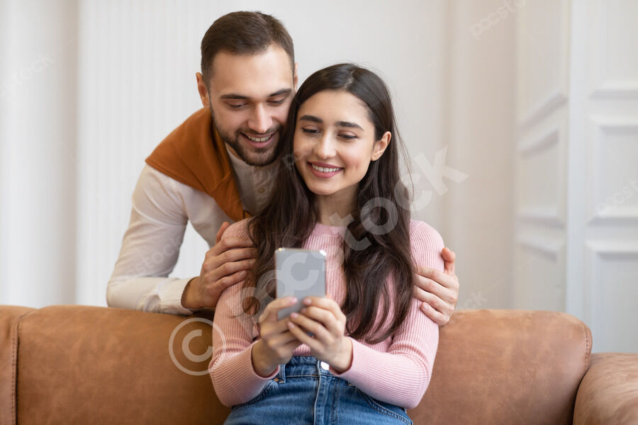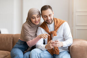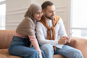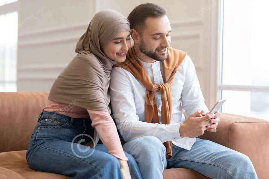 Arab Muslim woman in hijab and caucasian husband using smartphone together while sitting on sofa in living room at home