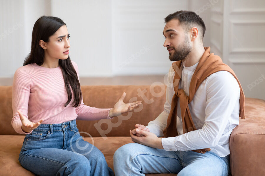 Arab woman gesturing and talking to her caucasian husband quarreling while sitting on couch at home