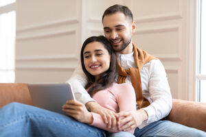 Arab and caucasian couple watching movie on tablet and hugging while sitting on sofa in living room at home