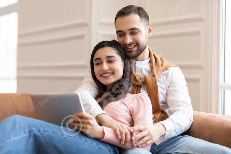 Arab Muslim woman in hijab and caucasian husband using tablet and hugging while sitting on sofa at home