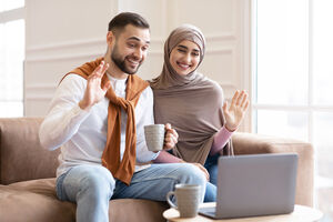Arab Muslim woman in hijab and caucasian husband having video call on laptop and waving their hands while sitting on sofa at home