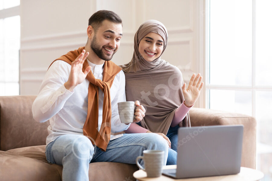 Arab Muslim woman in hijab and caucasian husband having video call on laptop and waving their hands while sitting on sofa in living room at home