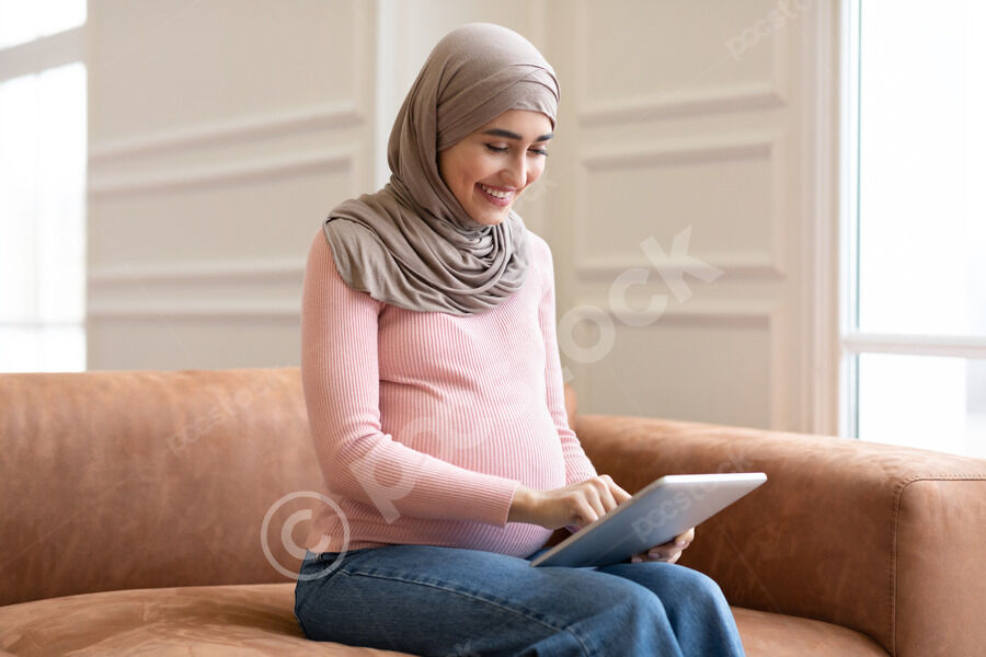 Arab Muslim pregnant woman in hijab using tablet and smiling while sitting on sofa in living room at home