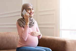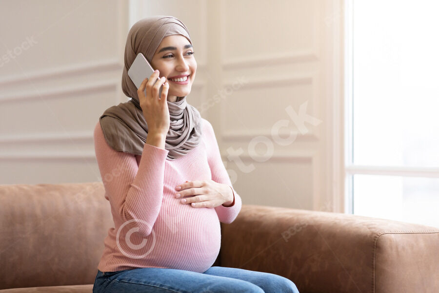 Arab Muslim pregnant woman in hijab talking on mobile phone and looking away smiling while sitting on sofa in living room at home