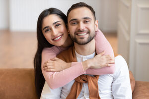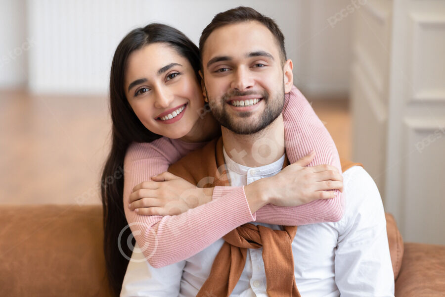 Arab woman hugging caucasian husband from behind sitting on sofa in living room at home