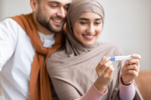 Arab Muslim woman in hijab and caucasian husband holding positive pregnancy test while sitting on sofa in living room at home