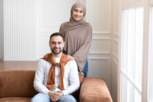 Arab Muslim woman in hijab standing with hands on shoulders of her caucasian husband sitting on sofa in living room at home