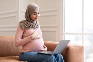 Arab Muslim pregnant woman in hijab touching her belly and looking at laptop screen while sitting on sofa in living room at home