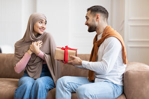 Surprised Arab Muslim woman in hijab receiving gift box with red ribbon from her caucasian husband while sitting on sofa in living room at home