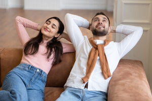 Arab Muslim woman in hijab and caucasian husband showing new house key and looking at each other smiling while sitting on sofa in living room at home