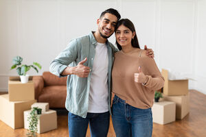 Smiling Arab couple hugging each other showing thumbs up sign while standing near cardboard boxes in living room at home