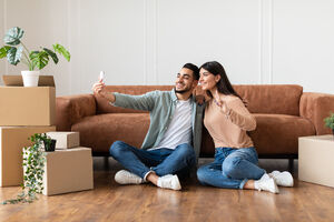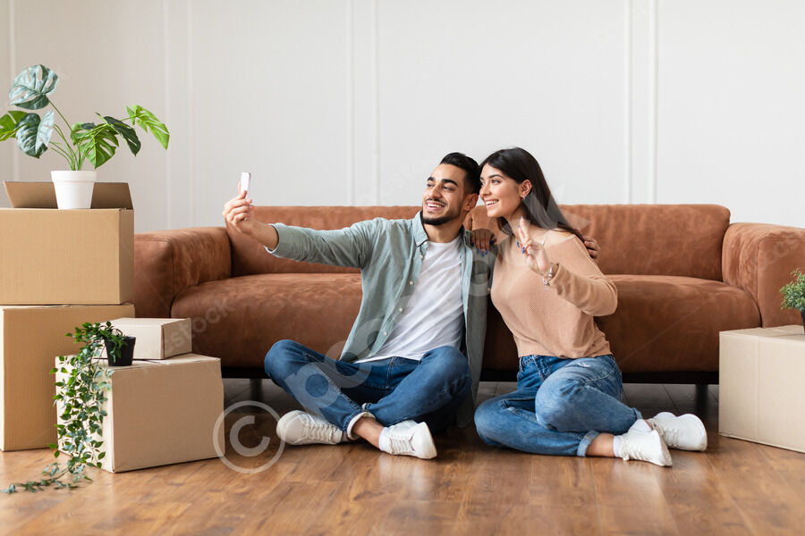 Cheerful Arab couple taking selfies on smartphone while sitting on floor near cardboard boxes in living room at home
