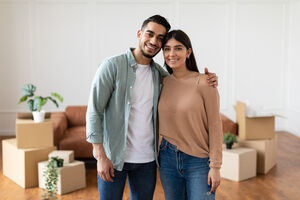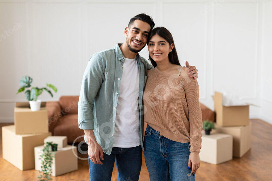Smiling Arab couple hugging each other standing near cardboard boxes in living room at home