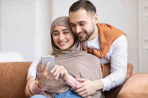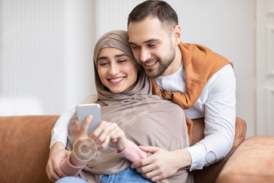 Arab Muslim woman in hijab and caucasian husband using smartphone together while sitting on sofa in living room at home
