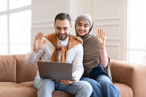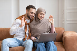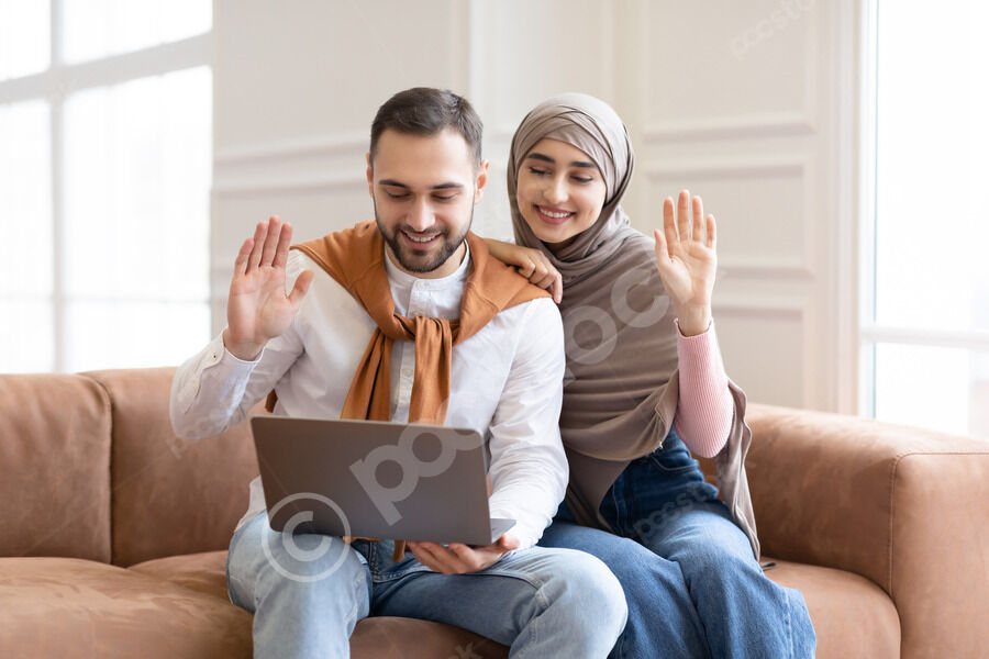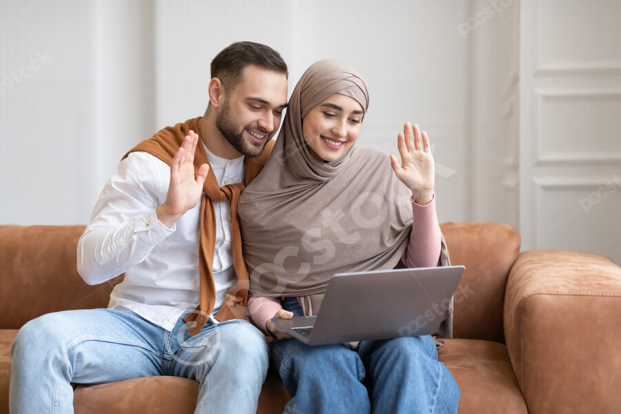 Arab Muslim woman in hijab and caucasian husband having video call on laptop and waving their hands while sitting on sofa at home