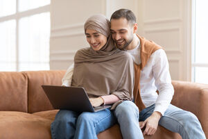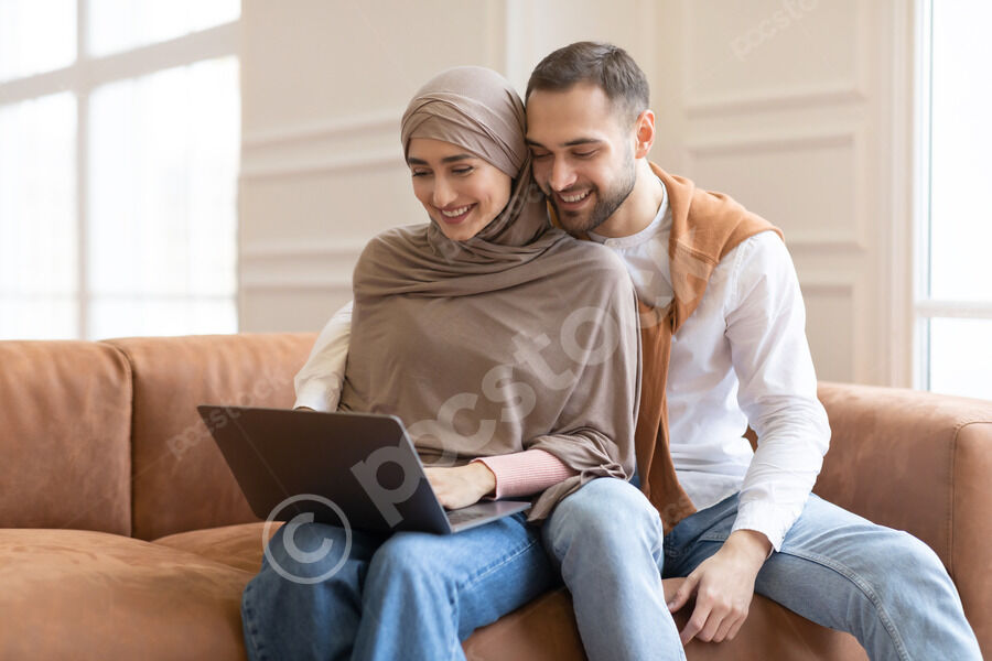 Arab Muslim woman in hijab and caucasian husband sitting with laptop on sofa in living room at home