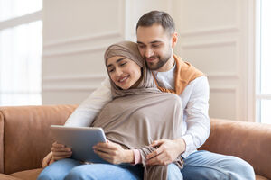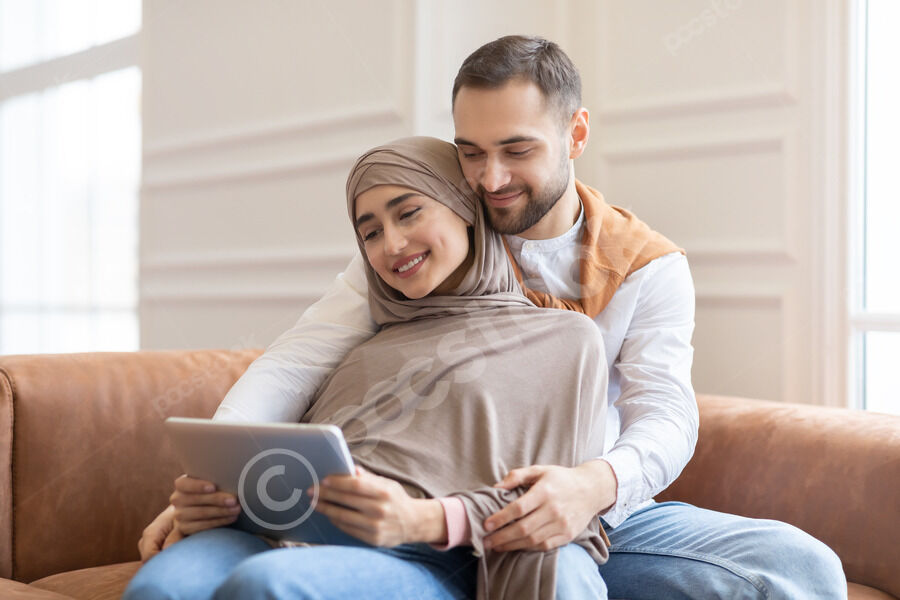 Arab Muslim woman in hijab and caucasian husband using tablet and hugging while sitting on sofa at home