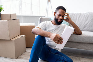 Stressed Arab woman wearing hijab leaning head on her hand and looking at laptop screen while sitting on sofa with documents in living room at home