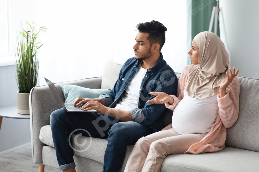 Arab woman wearing hijab typing on laptop while sitting on sofa at home
