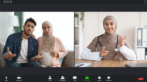 Arab woman wearing hijab attending online meeting using headset and laptop while sitting on sofa in living room at home