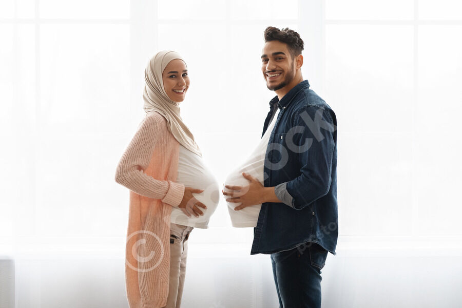 Arab woman wearing hijab exercising with dumbbells while standing in living room at home