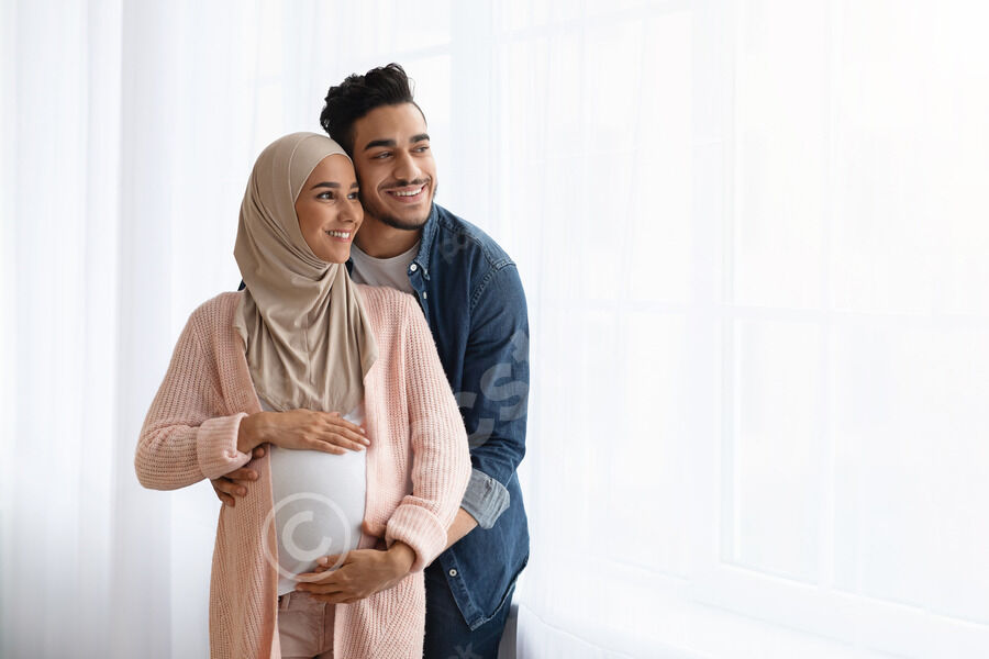 Arab woman wearing hijab having phone call and looking away while sitting on sofa in living room at home