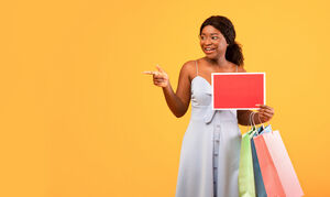 Black woman holding colorful shopping bags and red banner looking and pointing away while standing against a yellow background in studio