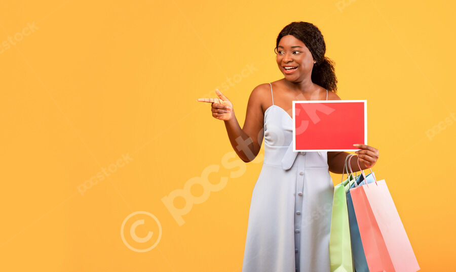 Black woman with colorful shopping bags holding and looking at white banner while standing against a yellow background in studio