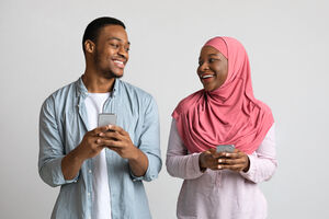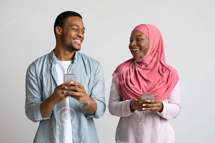 Black man and muslim wife in hijab holding smartphones and looking at each other while standing against gray background in studio