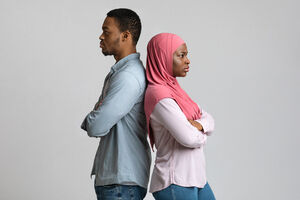Black muslim woman in hijab leaning arm on shoulder of Black man while standing against gray background in studio