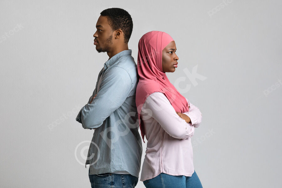 Black muslim couple feeling frustrated after quarrel standing back to back against gray background in studio