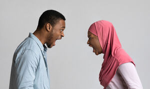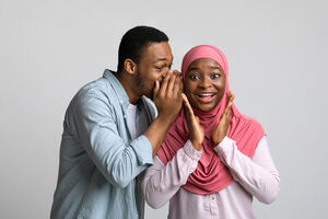 Black man whispering to each of shocked muslim girlfriend in hijab while standing against gray background in studio