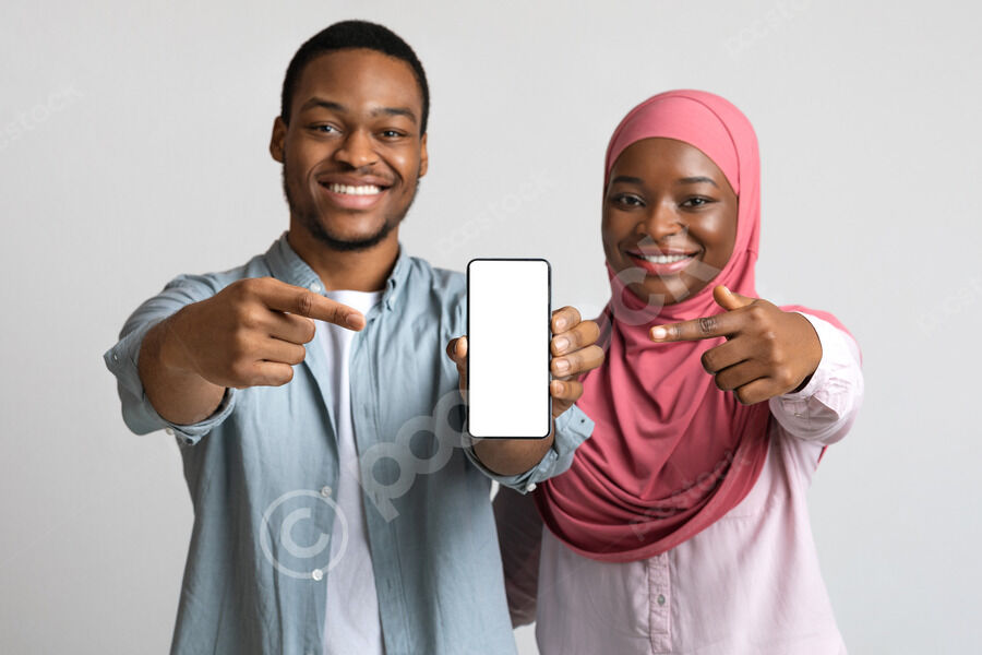 Black man and muslim wife in hijab holding and pointing at smartphone with empty white screen while standing against gray background in studio