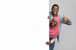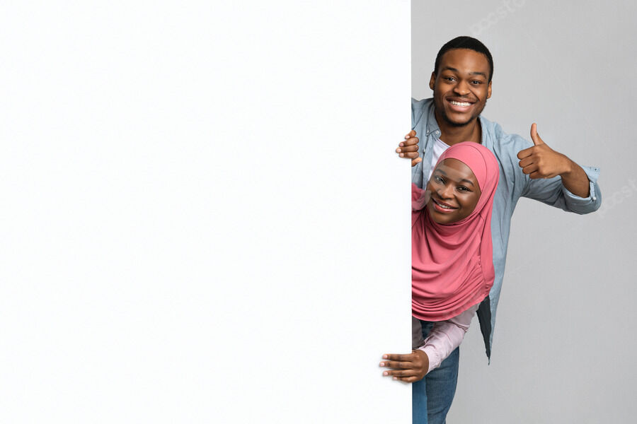 Black muslim couple peeking behind big white empty board and showing thumbs up standing against gray background in studio